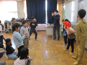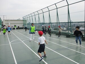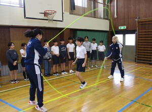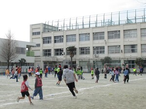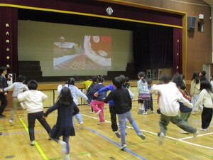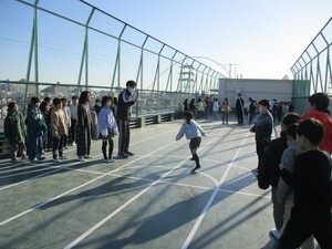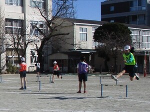 1年6年は校庭で鬼ごっこ、2年5年は体育館で俊敏性トレーニング、3年4年は屋上で長なわ跳びをしました。