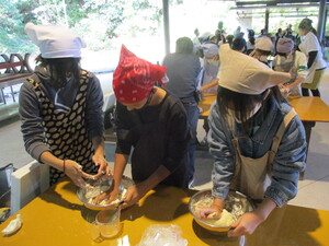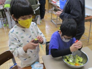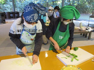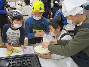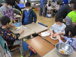 「卵をどうやって割るの」と友達に聞いている子もいましたが、教えてもらいながら調理を進めていきます。