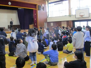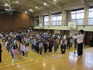 全校朝会で、合唱部が東京都教育委員会から表彰されたことをこどもたちに報告しました。