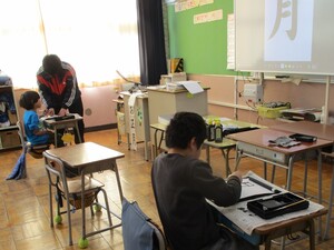1年生が登校してくると下駄箱、1年生の教室に6年生が待機し、1年生のお手伝いをしています。