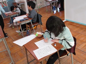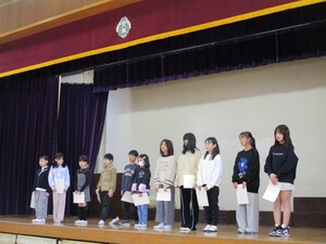 全校朝会で、「大田区立小学校 連合書写展」に出品した代表児童の皆さんに表彰状を渡しました。