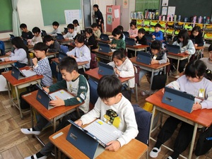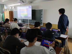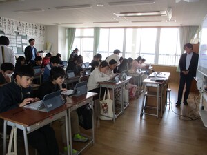 英語の授業はタブレットを活用し、日本語と英語の神経衰弱ゲームや「志茂田中学校には部活はいくつあるか」など中学校の生活にかかわる英語クイズを行いました。リアルタイムで正解率が表示され、集中しながらも楽しんで英語を学んでいました。