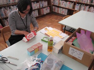 今日の図書整備は、図書グッズ小物入れづくり、紙クリップづくりなど、こどもたちが読書に親しめるよう環境整備をしていただきました。
