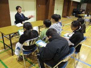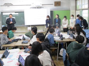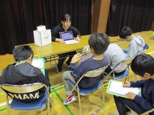 3校合同の体験で、本校からは大臣、副大臣、委員役として参加し、その他の全員で賛成・反対ボタンを押して採決しました。