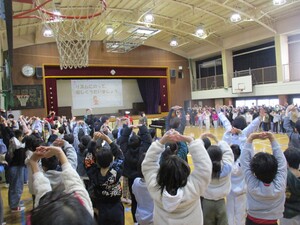 軽くストレッチをした後、寒さを吹き飛ばす元気な歌声を体育館に響かせました。
