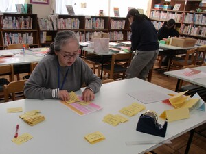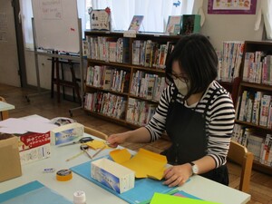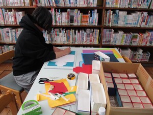 本日は、(1)小物入れづくりの続き、(2)卒業生用プレゼントづくり(しおり・しおりカバー)、(3)図書室用季節の装飾づくりをしていただきました。