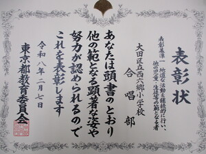 この表彰は、70年間に渡って合唱部の活動を継続して行い、他の児童の模範となっていることによるものです。