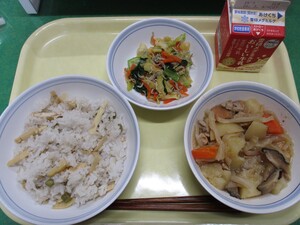 炊き込みご飯 小松菜のしらす和え 肉じゃが煮 牛乳