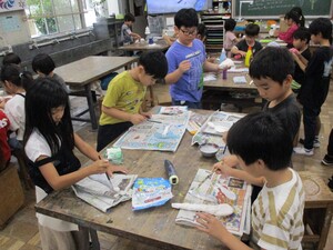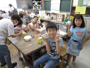 2年2組の図工は学芸会で使う小道具となるソフトクリームやプリン、ペロペロキャンディ、スプーン、お菓子箱などを友達と協力しながら楽しそうに作っていました。