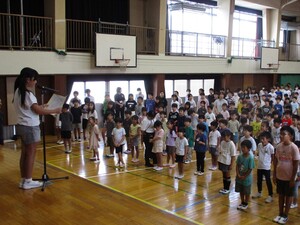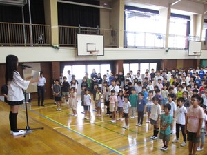 本校の特色「歌声の響く学校」の取組の一つである音楽朝会を行いました。