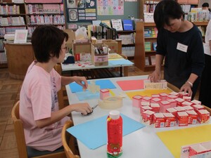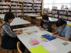 今日は、図書カードの点検、読んでいる途中のページを挟み込む紙製クリップづくりをお願いしました。