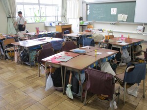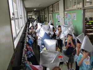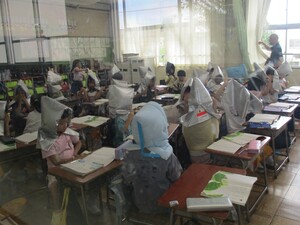 そして、避難訓練がありました。地震を想定し、画像(低学年)のように机の下に身を隠して安全確保を行いました。その後、さらに津波警報が発令された想定で屋上への避難も予定していましたが、雨天のため各学級で後日避難経路を確認としました。