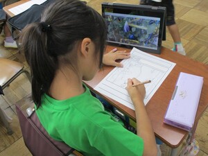 こどもたちは、消防車の細かいところまでよく見て、一筆書き、またよく見て、一筆書くという作業に集中していました。