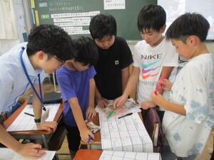 これまでの町探検でインタビューしてきたことを1年生に伝えるために、どの内容をどんな方法で伝えるのかをグループで話し合いました。