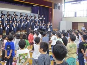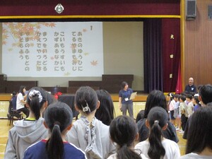 音楽朝会は、秋を感じる歌「もみじ」と今週土曜日のミニコンサートで歌う「世界中のこどもたちが」を全員で歌いました。