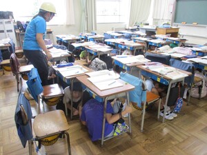 地震を想定し、机の下にもぐり、体の安全を守った後、校庭に避難しました。