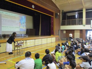 2時間目、体育館で道徳授業地区公開講座として、本校スクールカウンセラー2名が2年生・3年生、保護者の皆様に「自分のことをよく知ろう」という題で話をしました。言葉の大切さ、心と体のつながり、いらいらした時のリラックスの方法などを学びました。