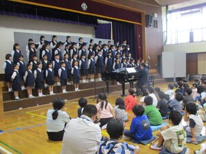 4時間目、体育館で全児童が集まり、西六郷少年少女合唱団と本校合唱部のミニコンサートを鑑賞しました。最後は全員で「世界中のこどもたちが」を歌いました。芸術の秋にふさわしいひとときになりました。