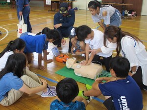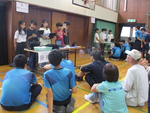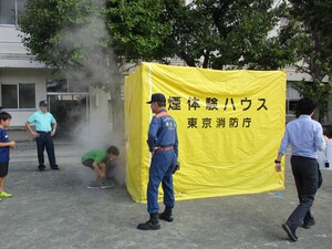 煙体験や心肺蘇生・AED訓練、消火器訓練に加えて、今回は本校5年生の防災についての発表がありました。