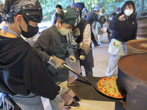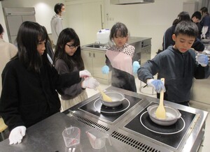 一人一人、自分で卵を割って味付けし、フライパンでかき混ぜながら炒めていました。