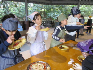 まず、平和の森公園の広場で4年生が考えた遊びを全員でしました。4年1組は「コンセント鬼」、4年2組は「まほう鬼」、4年四組は「鈴鬼」を考えてくれました。どれもみんなで仲良く遊べる工夫があり、鬼ごっこ3連続にもかかわらず、最後まで走り回って楽しんでいました。広場で遊べる時間がまだ少しあったので、ドッジボール、長なわ跳び、四葉のクローバー探しなどを思い思いに楽しみ、早めの昼食にしました。たくさん体を動かしたのでお弁当もおやつもしっかりと食べました。