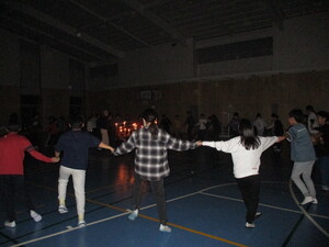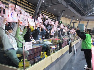 大田区総合体育館で行われているバスケットボールの観戦です。応援の声が選手の方たちにとって聞こえにくいため、応援ボードを掲げたり、サインエールを送ったりしながら選手の方たちの活躍を観戦しました。
