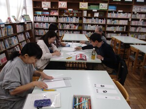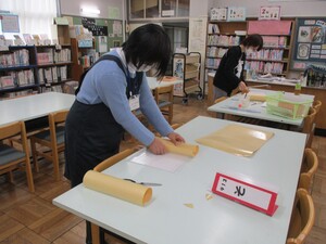 今日の図書整備は、先月に引き続き、棚に差し込むサイン板の製作を行っていただきました。