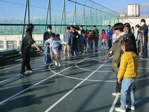 1年6年は屋上で長なわとび、2年5年は校庭でふえ鬼、3年4年は体育館で敏捷性トレーニングを行いました。