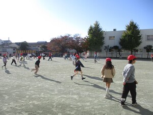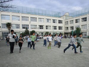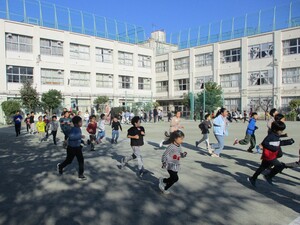 朝の時間に2年4年6年四組のこどもたちが校庭を走りました。