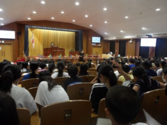 運動委員会がプール開き集会を行いました。水泳学習を行う上でのきまりや注意することを、手本を見せながら説明しました。