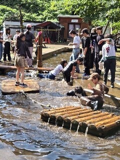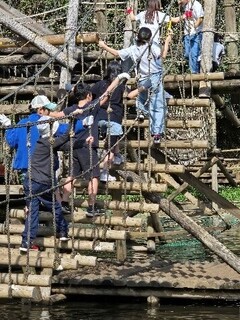 アスレチックは4つのステージに分かれており、友達と協力し合いながら50個のアスレチックに挑戦しました。始めは水に落ちないように慎重になっていましたが、晴天で気温が高かったことから段々と気持ちも開放的になって運動に親しみ、友達との仲を深めました。