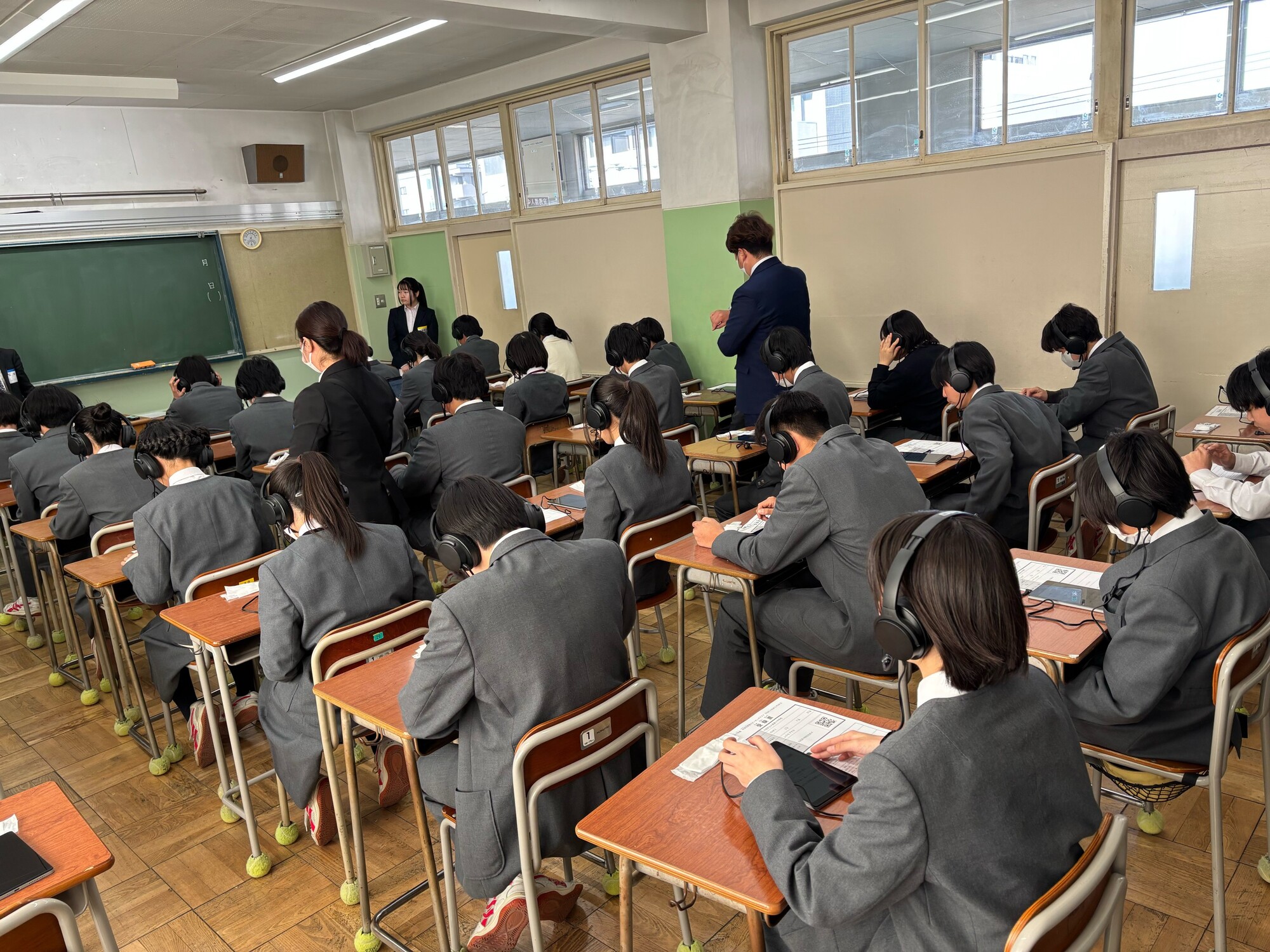 1、2年生の「中学校英語スピーキングテスト(ESAT-J )」の様子です。「どのくらい英語が話せるようになったか」を測るテストです。タブレットの画面上のイラストを見て、英語で説明します。