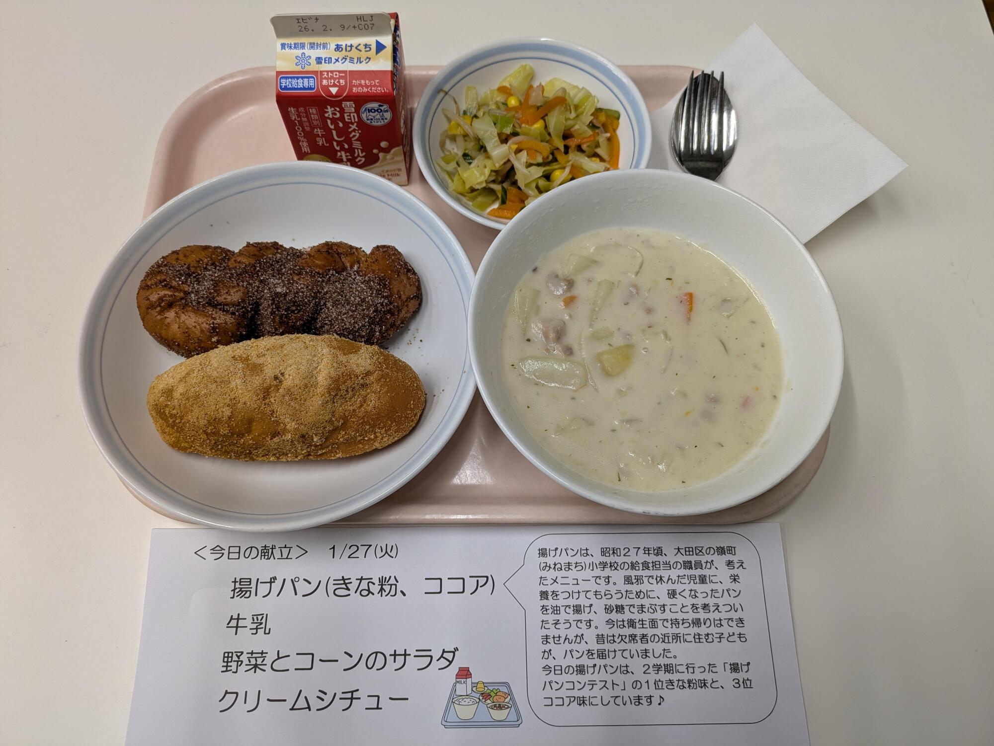 今日の献立は、「揚げパン、野菜とコーンのサラダ、クリームシチュー、牛乳」になります。揚げパンは、校内で揚げパンコンテストを行い、その第一位「きな粉味」、第三位「ココア味」になります。