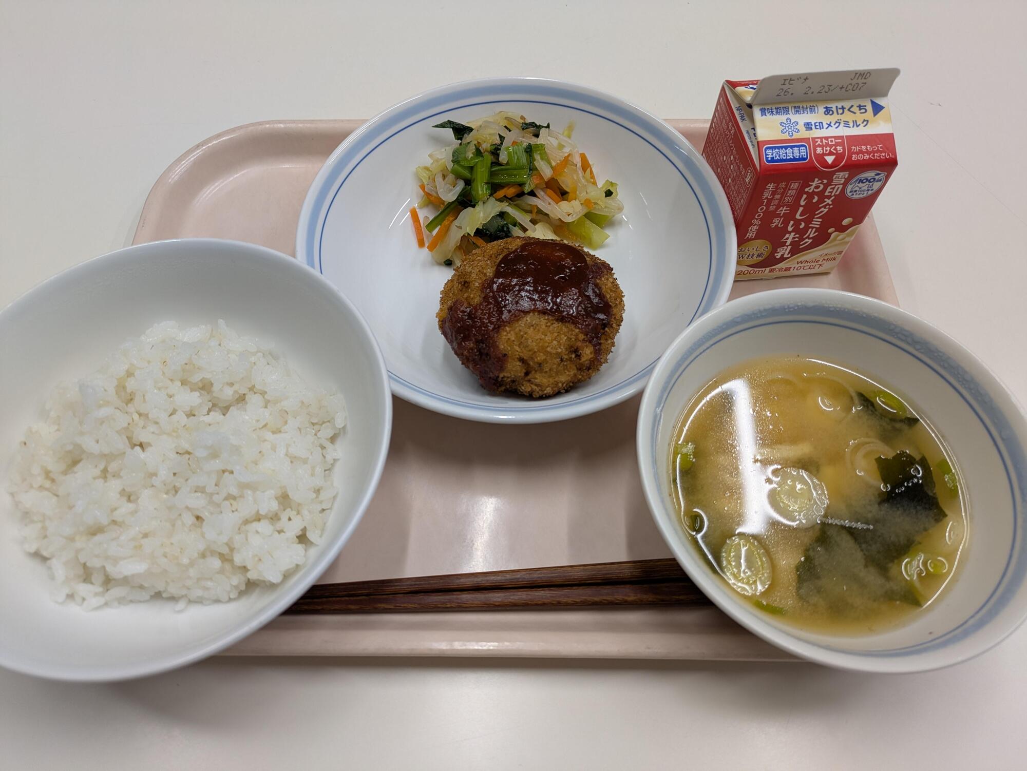 今日の献立「ご飯、きのこメンチカツ、キャベツのおかか和え、豆腐の味噌汁、牛乳」です。東邦大学と大田区の栄養士との共同開発献立になります。