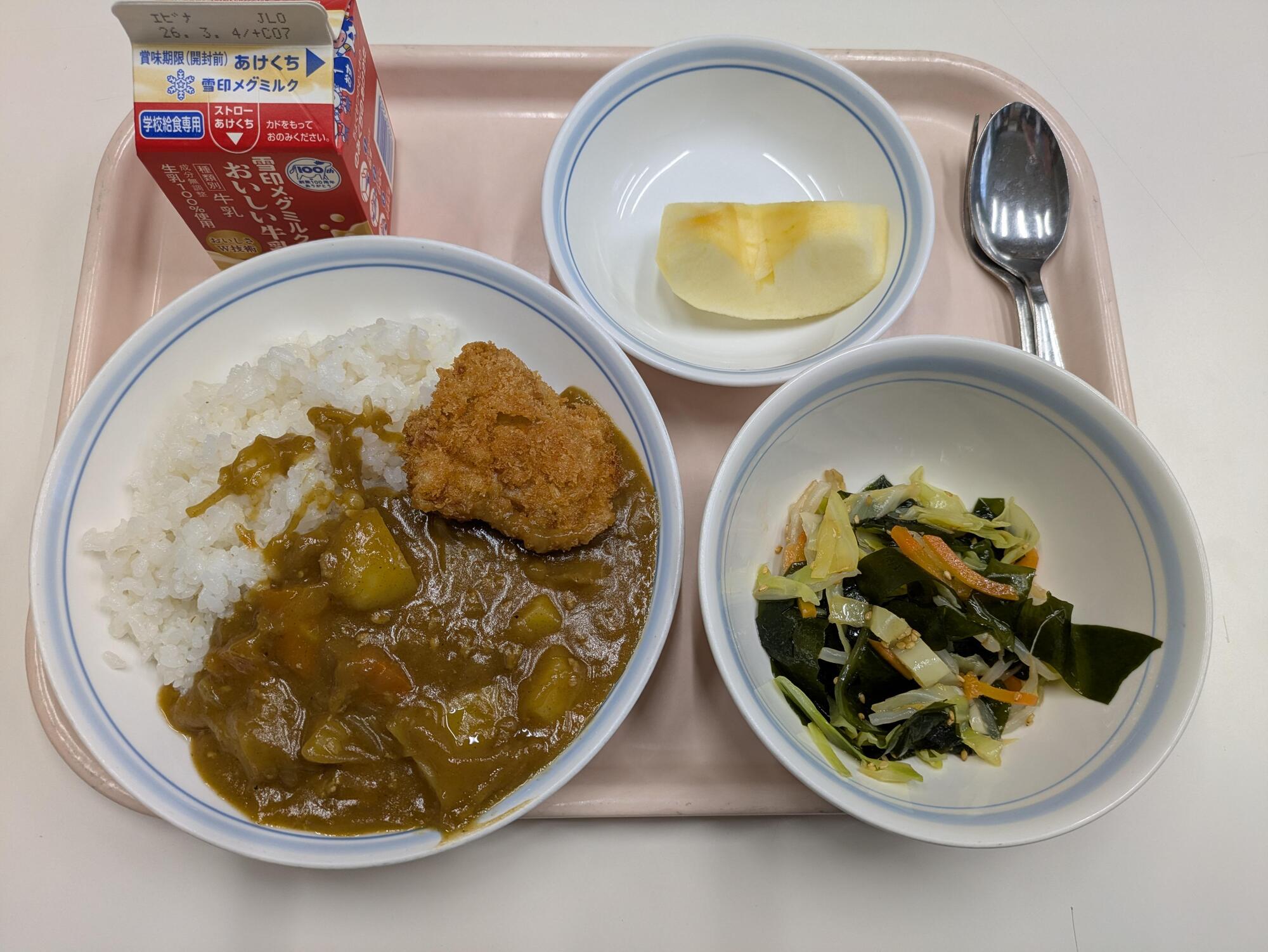 献立は受験応援献立「チキンカツカレー、わかめサラダ、リンゴ、牛乳」になります。カツカレー食べて、受験に勝つ!頑張れ、受験生!応援してます!!!