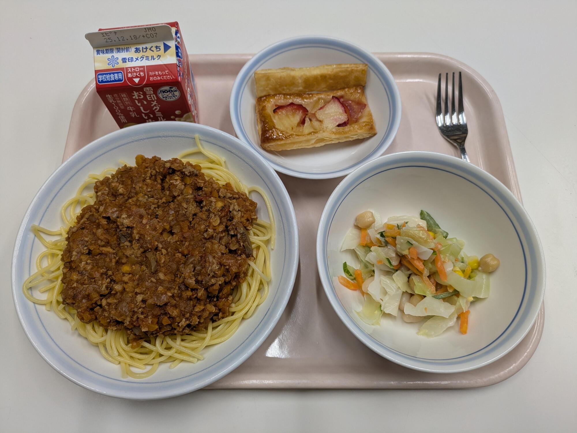 献立は、「スパゲッティミートソース、ビーンズサラダ、アップルパイ、牛乳」になります。アップルパイは、手がかかる料理です。美味しかったです!