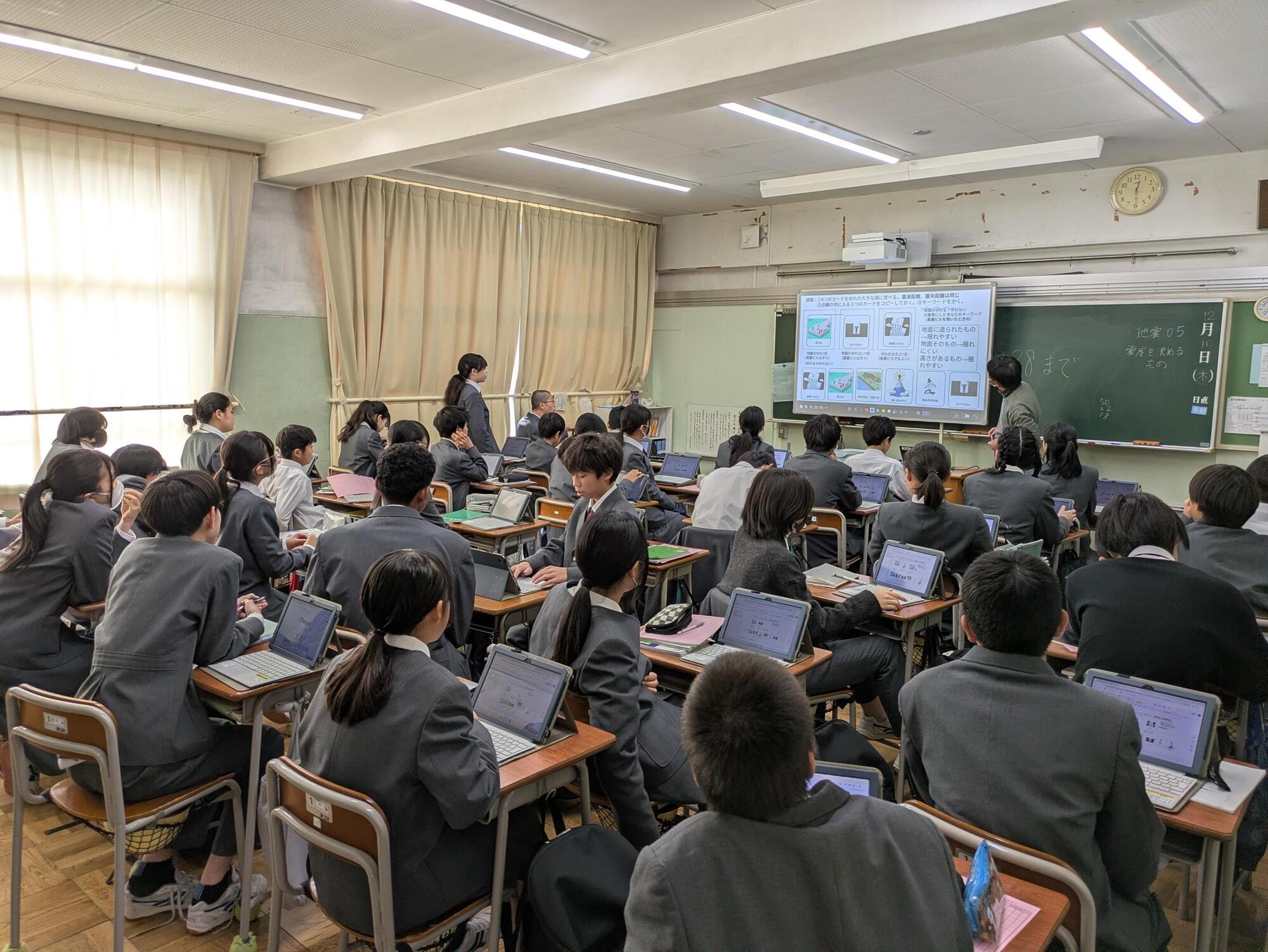 単元名「大地の変化」。ICT(Googleスライド)等を活用し、教師との対話や生徒同士の意見交流を通して、学びを深めていきます。