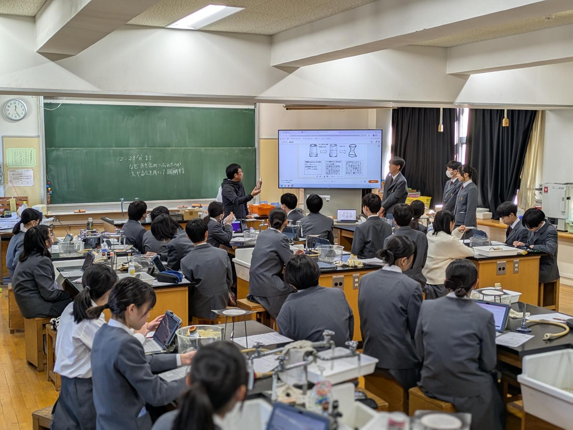 単元名「圧力と大気圧」。実験を通して、「なぜ?」「どうして?」という疑問から、自ら仮説を立て、実験・観察で検証するプロセス(探究)を通じて、問題解決能力や論理的思考力を育んでいきます。