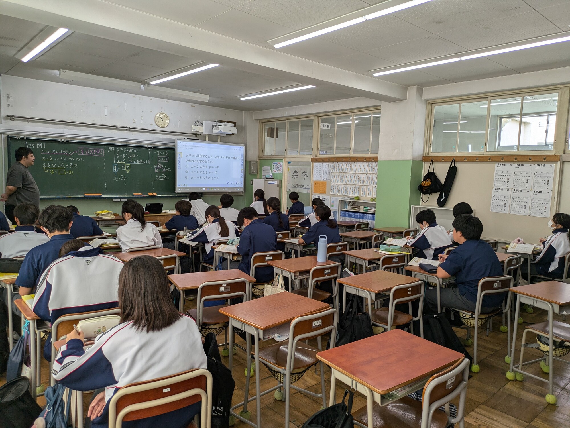 数学の習熟度別授業になります。板書で、大切な所を色分けし、ICTを併用しながら、ゆっくり丁寧に教えていきます。全体指導の後、個別に対応していきます。