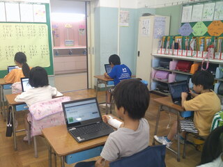 1年生の教室に行ってみると、みんなタブレット端末に向かって、何かに夢中に取り組んでいました。