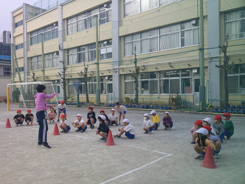 2年生の体育の学習の様子を紹介します。 校庭に出てみると、寒さに負けず、2年生が意欲的にミニハードル走に取り組んでいました。 1時間で、跳ぶリズムや歩幅に気を付けて何度も走りました。 特に、高く跳ぶのではなく、前に速く跳んで走り抜けることを意識して練習しました。 ミニハードル走で学んだことが、実際のハードル走に生かされます。 真面目に話をよく聞いて練習したので、最初と最後で跳び方が変わったようです。