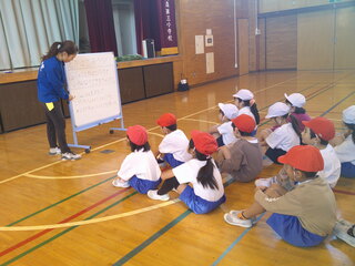 サーキット形式で取り組んだ、「ふみこしとび」「またぎのり&またぎおり」「とびあがり&とびおり」「開脚跳び」では、「もっとやりたい。」「さっきよりできるようになった。」「〇〇さん、きれいに跳んでいたね。」「もうちょっとだよ。」と言いながら繰り返し練習をしていました。