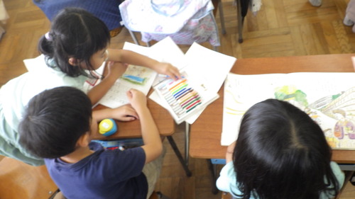 最後に見たクラスでは、学校探検クイズのカードを仕上げていました。