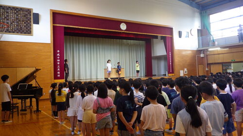 校長の話の中では、明日から始まる生命尊重・エールウィークに向けて、「水難事故(例年9月も起きる)」「自転車事故」「スマートフォン」を通したインターネットトラブルなどに巻き込まれないためにできること、そして、エールの例として各学年のよいところについて話をしました。