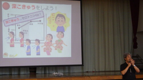 元気の素「セロトニン」を増やすためには、運動・呼吸・日光などが必要なこと、睡眠の素「メラトニン」はセロトニンの分泌量や暗闇に影響を受けることなどについて、3年生の生活につなげてプレゼンテーションをしてくださいました。