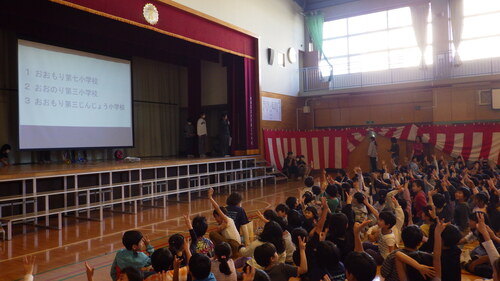 大きな歓声が上がり、全校で盛り上がったところで、大森第三小学校の校歌を今回の開校100周年に合わせて作った4番も含めて歌いました。(給食も御祝い献立でした。)