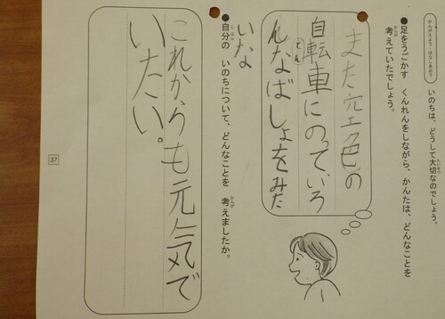 ワークシートには、日々の健康維持、自転車の乗り方、命を大切にする行動など、自分の考えを書くことができていました。