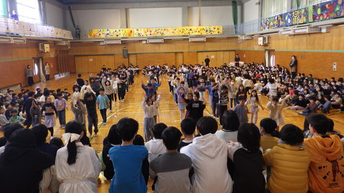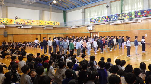 「何が起きるんだろう。」という雰囲気の中、学年ごとに、ステージ前のひな段に座っている6年生に出し物を見せました。