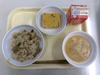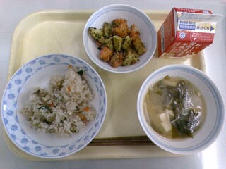 調理員さんのアイデアで、各学級5枚ずつごはんに星型にんじんが入っていました。