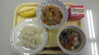 炒め物のキャベツ、しめじ、汁物の根菜類やデザートのバナナで、食物繊維とカリウムをしっかり摂取できる献立です。